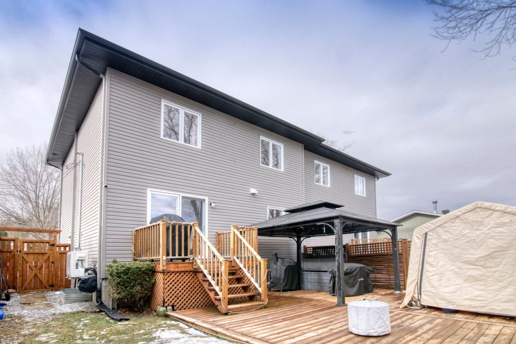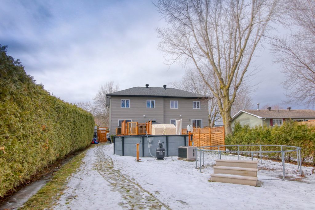 Magnifique jumelé contemporain impeccable! Offrant 3 chambres à l’étage dont une avec walk-in, salle de bain moderne avec douche en verre, cuisine fonctionnelle avec îlot et garde-manger walk-in. Salon lumineux, salle à manger avec porte-patio. Sous-sol complètement aménagé avec grande salle familiale. Terrain clôturé de ±7 135 pi² bordé de haies matures, avec piscine hors terre chauffée et remise. Secteur paisible près de la ville!